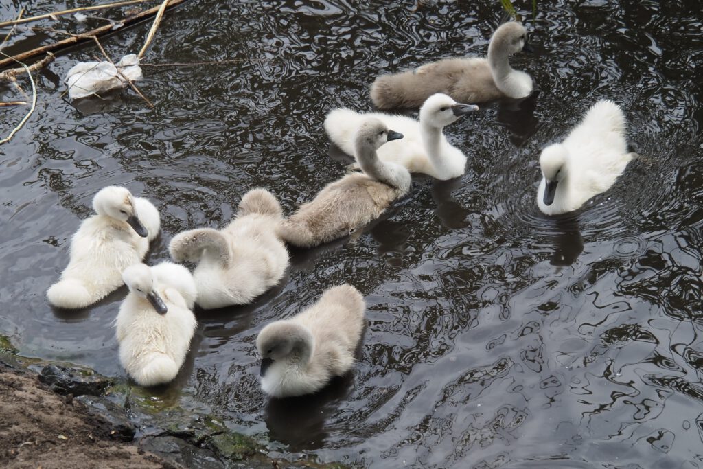 Gisteren zwommen er acht zwaantjes in de Nieuwe Vaart bij het sluisje en de Pelikaanbrug voor de Oosterkerk. Half mei kropen zij uit het ei in het nest op de drijvende tuinen van provo Jasper Grootveld vlak bij het Scheepvaartmuseum.