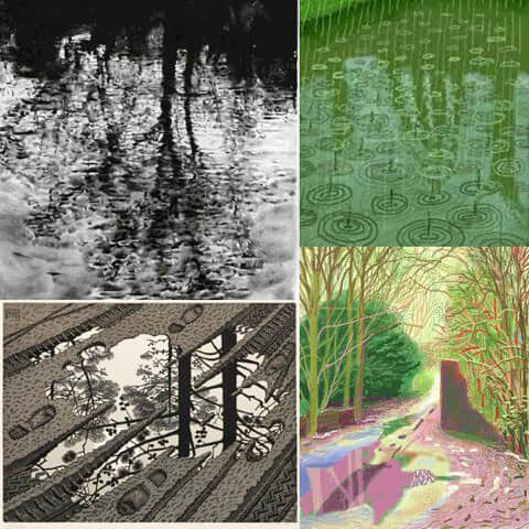 De herfst is begonnen en overal zijn prachtige weerspiegelingen te zien. (In de regenplassen). Ook de kleuren zijn mooi, de oranje en gele bladeren en de donkere (bijna paarse) boomtakken. De kleuren doen het goed bij een grijze hemel. En wat zijn de wegen toch prachtig na een regenbui. Vooral in de avond of nacht wanneer de lantaarns spiegelen op de beregende straten. Alles wordt weer schoon gewassen.
