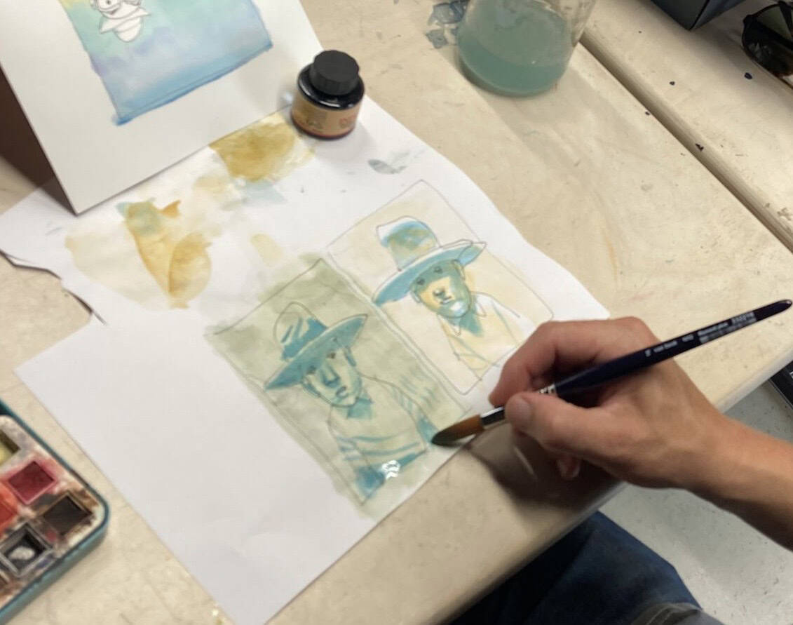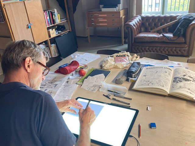Pen, papier en aquarelverf is aanwezig en verder kun je gebruik maken van een lichtbak voor de verschillende schetsfases.