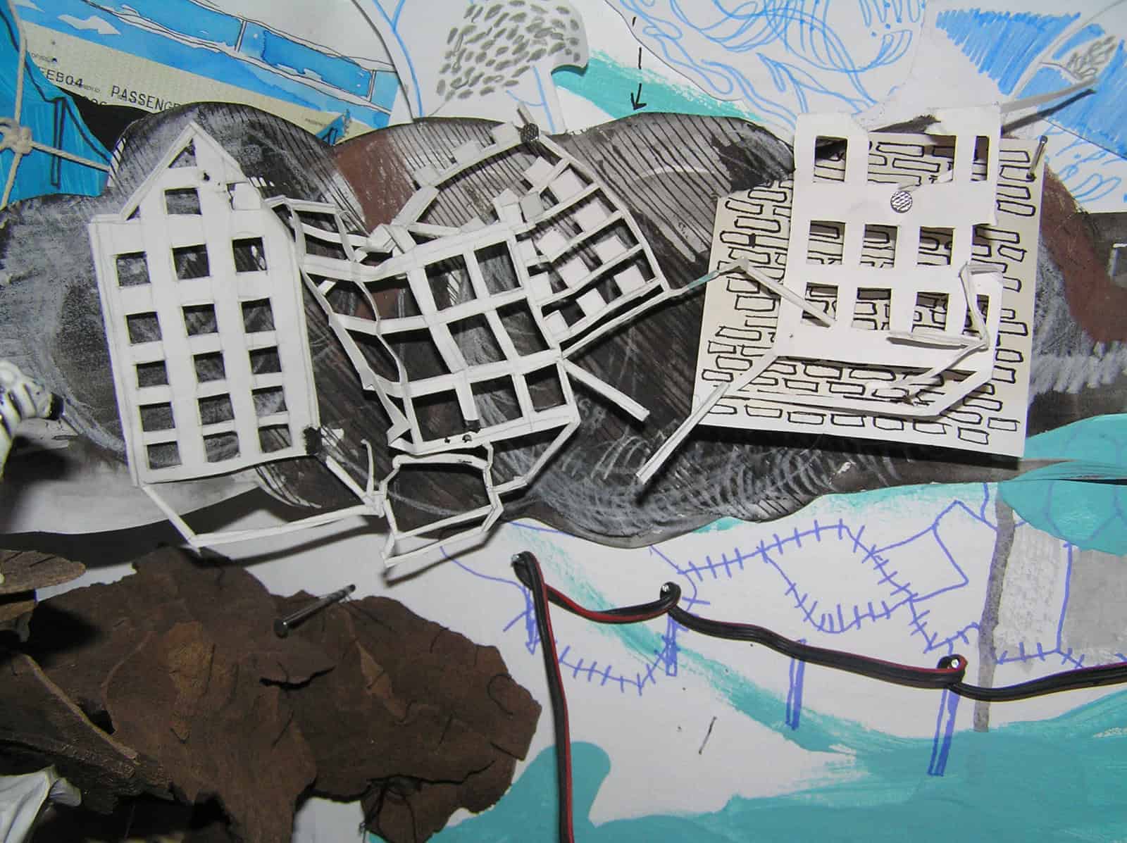 We beginnen met het maken van ‘bouwstenen’: we tekenen, schilderen, knippen en verzamelen fragmenten uit oude boeken. Met kleefgum en lijm bevestigen we deze op vellen papier en panelen die tegen de muur hangen. Je kiest een beginpunt en als een klimop die een gevel overneemt, begin je te bouwen.