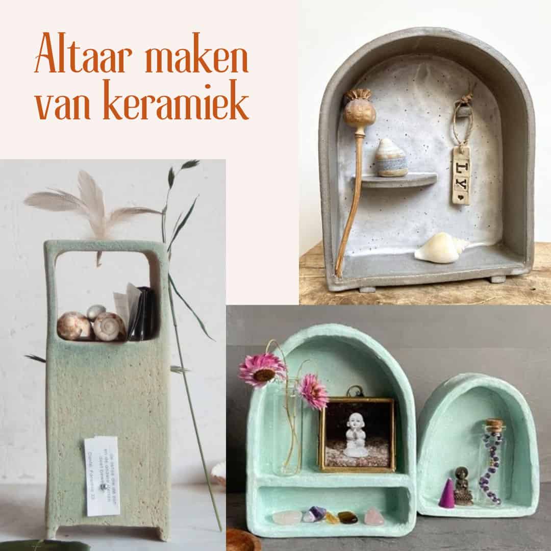 Een (huis)altaar kan een plek zijn waar je wat mooie spulletjes verzamelt en misschien een kaars laat branden. Een klein rustpuntje in je huis, een speciaal plekje met aandacht voor geliefden, mooie vondsten of een bijzondere herinnering. In deze tweedaagse workshop gaan we een altaartje maken van keramiek.