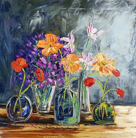 Na het aanvankelijke tekenend schetsen wordt er met acryl geschilderd. Dit zal begeleid worden en in stappen opgebouwd. Hierbij wordt de acrylverf op verschillende manieren gebruikt, van transparant tot dekkend en eventueel extra pasteus voor accenten en variatie in schilderwijze. Dit alles om een ‘levendig stilleven’ als geheel te creëren